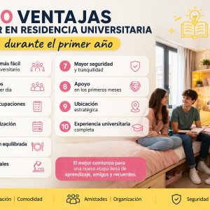 El primer año de universidad es una de las etapas más importantes en la vida de cualquier estudiante. Nuevos retos, independencia, cambios de rutina y un entorno completamente diferente hacen que la adaptación sea clave. Por eso, cada vez más estudiantes optan por vivir en una residencia universitaria durante su primer año, una opción que ofrece comodidad, apoyo y un entorno ideal para empezar esta nueva etapa. 1. Adaptación más fácil a la vida universitaria El cambio de instituto a