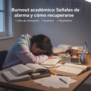 Señales de alarma y cómo recuperarse del Burnout académico ¿Qué es el Burnout académico? 🏫 El burnout académico es un estado de agotamiento físico y emocional, resultado de la presión excesiva y la carga de trabajo en el entorno universitario. Es importante reconocer sus señales para tomar acciones a tiempo y evitar consecuencias mayores. Señales de alarma ⚠️ 1. Fatiga constante 💤 Te sientes cansado, incluso después de descansar. La falta de energía afecta tu rendimiento diario. 2. Pérdida de